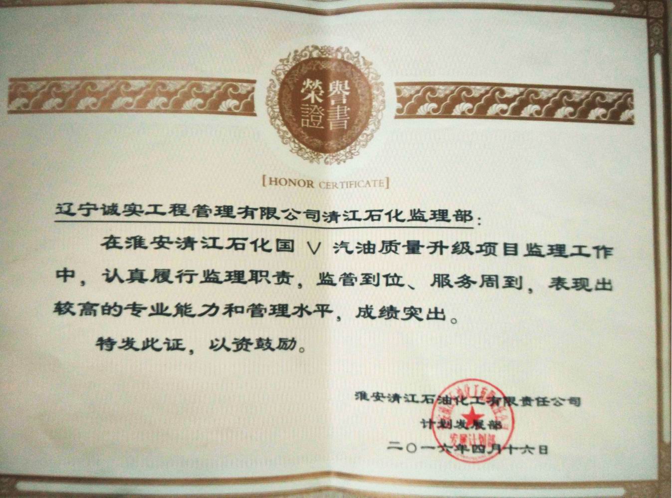 2016年淮安清江石化國V汽油質量升級項目獎狀