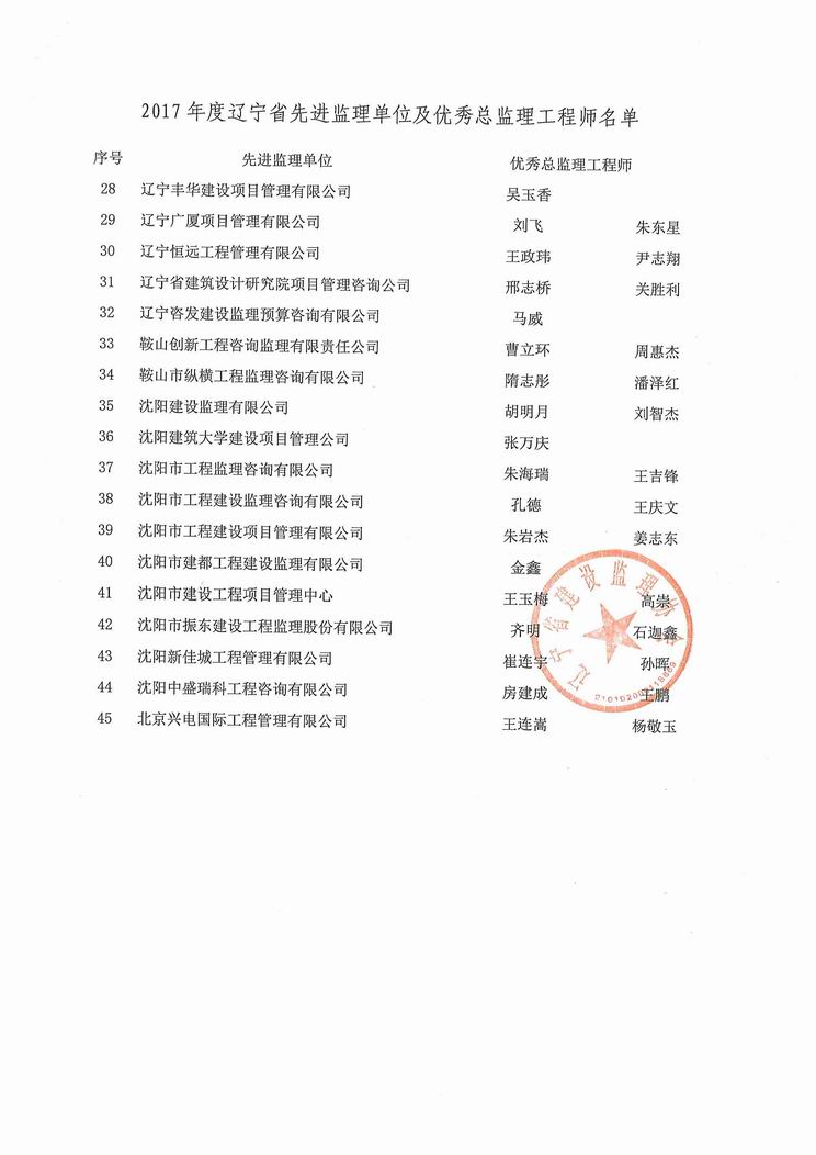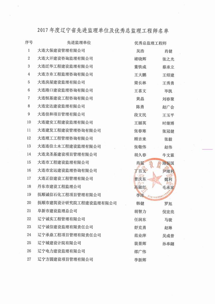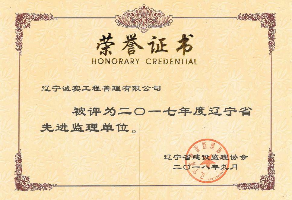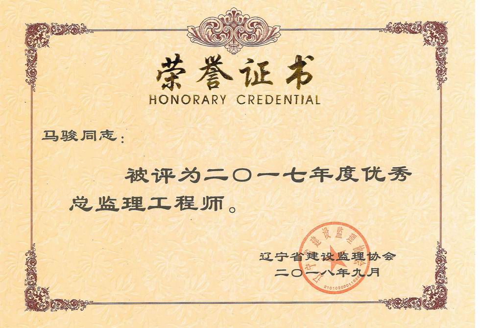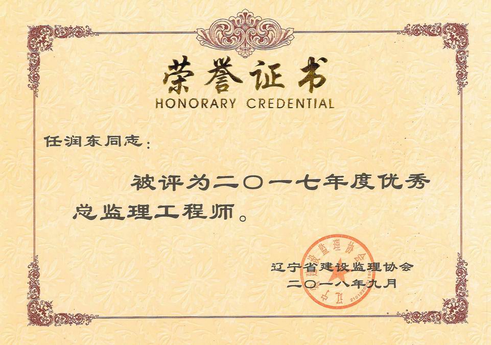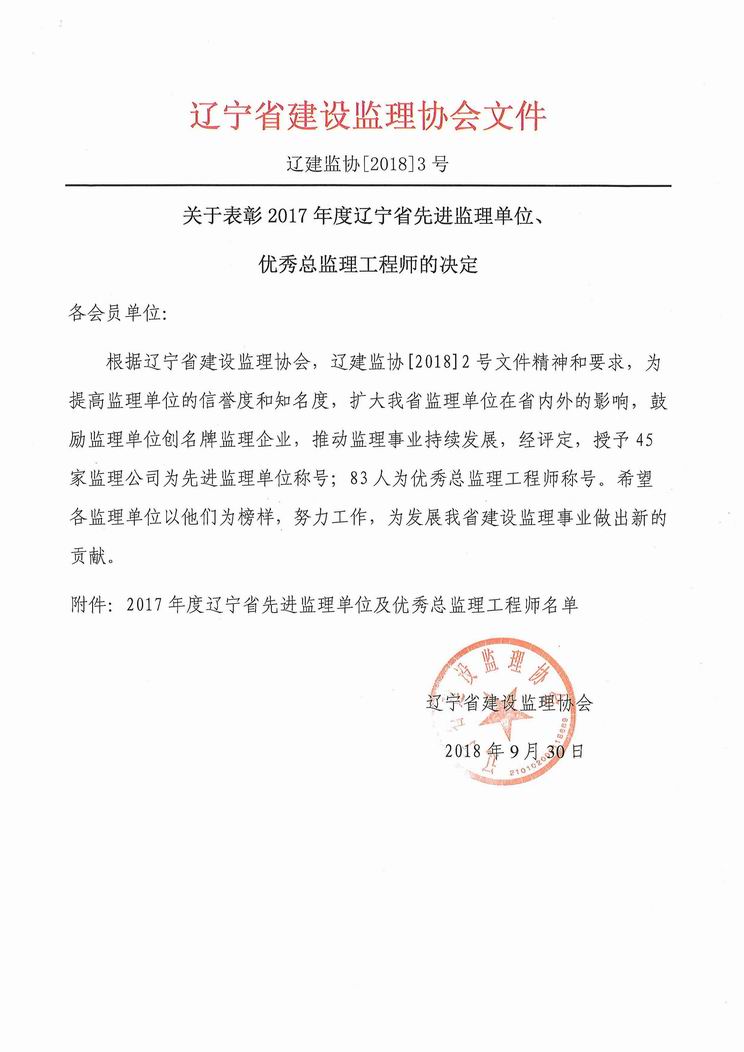 我公司被遼寧省建設(shè)監(jiān)理協(xié)會評為2017年度遼寧省先進監(jiān)理單位、任潤東和馬駿被評為優(yōu)秀總監(jiān)理工程師
