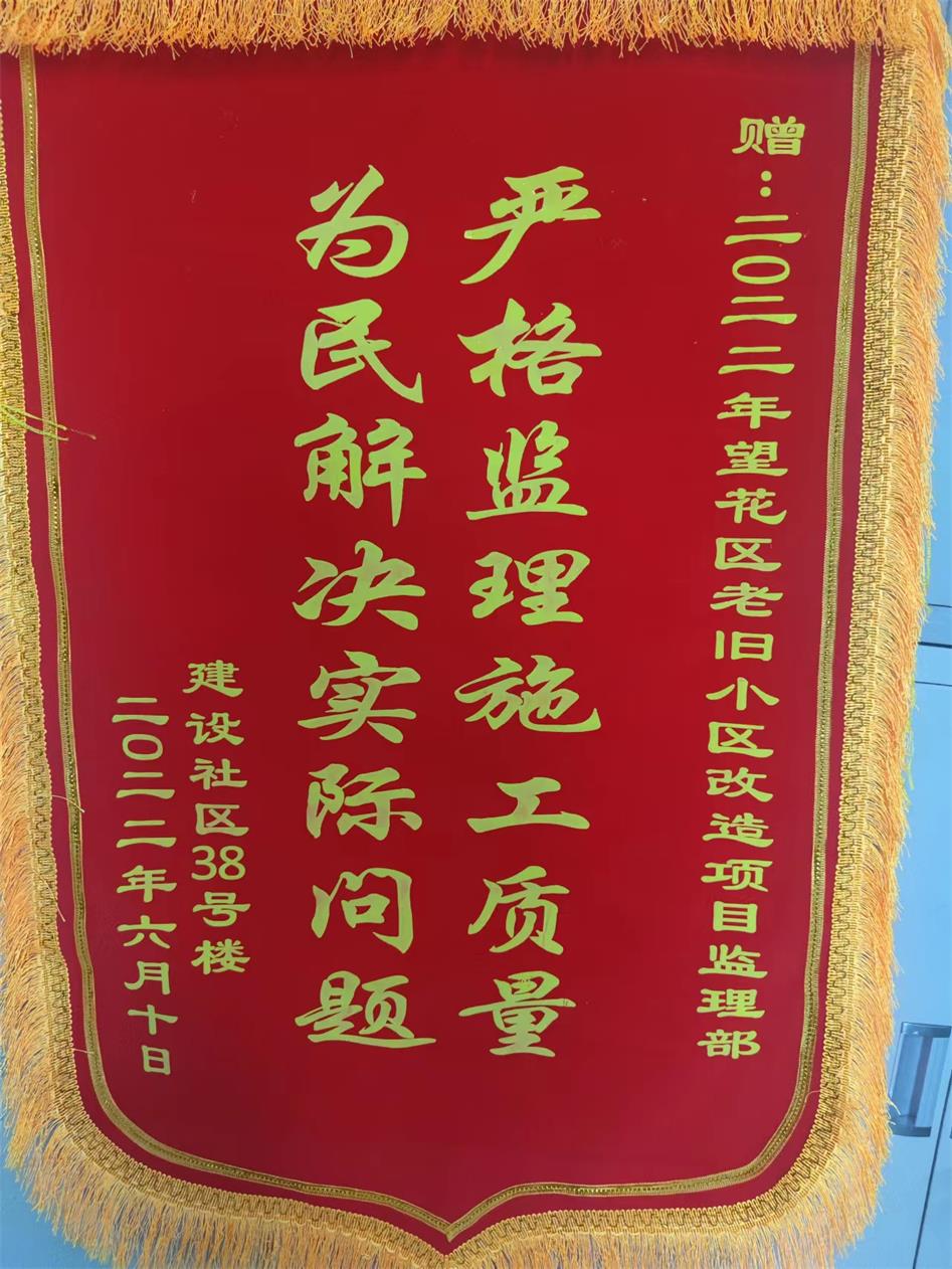 千濤萬漉雖辛苦,吹盡狂沙始到金。一面錦旗既是一份肯定。我們將秉承“誠實(shí)、責(zé)任、專業(yè)、超越”的監(jiān)理精神,接受政府和市民的共同監(jiān)督,一如既往、不忘初心、盡職盡責(zé),為推動(dòng)老舊小區(qū)改造,優(yōu)化小區(qū)環(huán)境治理,建設(shè)文明城市做出應(yīng)有的貢獻(xiàn)!