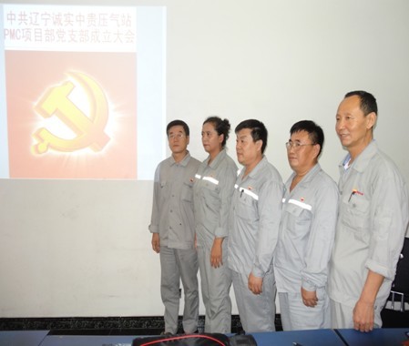 2013年7月21日遼寧誠(chéng)實(shí)中貴線壓氣站PMC項(xiàng)目部黨支部成立大會(huì)正式召開,大會(huì)由公司黨委委員趙樹環(huán)同志主持,首先介紹了了黨支部成立的意義和目的,然后進(jìn)入了大會(huì)流程。通過(guò)全體黨員民主評(píng)議、選舉,盛孝福同志當(dāng)選為PMC項(xiàng)目部黨支部書記,師興華同志當(dāng)選為黨支部組織委員,胡德林同志當(dāng)選為黨支部宣傳委員,趙樹環(huán)同志代表公司黨委對(duì)黨支部成立表式祝賀。黨支部全體黨員在黨旗下進(jìn)行了鄭重宣誓,最后由黨支部書記作表態(tài)發(fā)言。