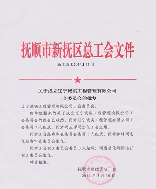 經(jīng)過近兩個月的籌備,誠實工會現(xiàn)已履行完畢各個籌備程序,撫順市新?lián)釁^(qū)總工會已正式批準成立遼寧誠實工程管理有限公司工會委員會。公司工會由7名委員組成,下設經(jīng)費審查委員會和女工委員會。公司工會將根據(jù)機關及項目部的實際情況,相應成立工會分會和工會小組,發(fā)揮工會在企業(yè)中的積極作用,為企業(yè)的發(fā)展做出貢獻。