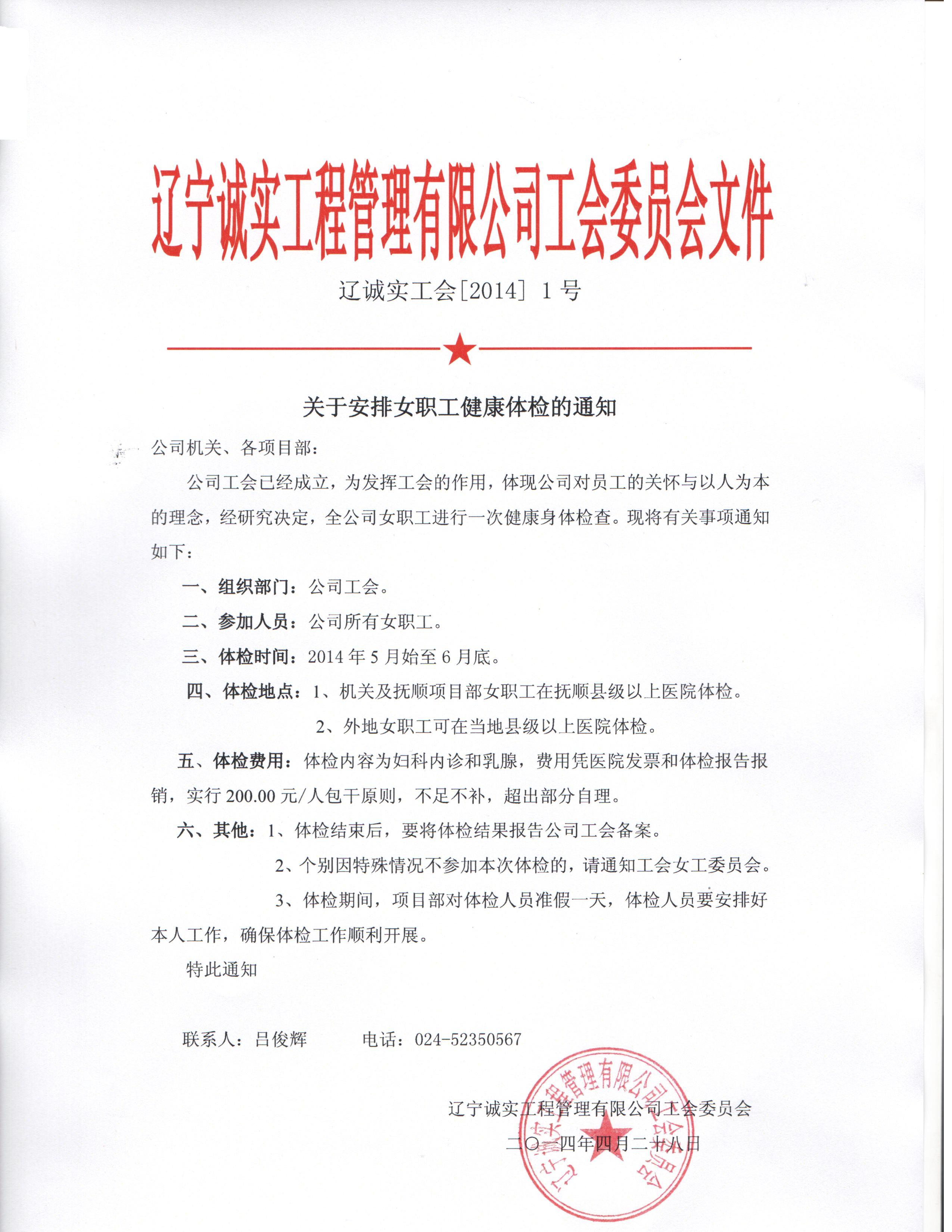 誠實工會將組織全體女職工于2014年5月底至6月底期間進(jìn)行健康體檢