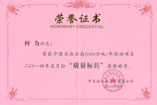 云南項(xiàng)目部何為同志榮獲中國石油云南1000萬噸/年煉油項(xiàng)目2014年5月份“質(zhì)量標(biāo)兵“榮譽(yù)稱號