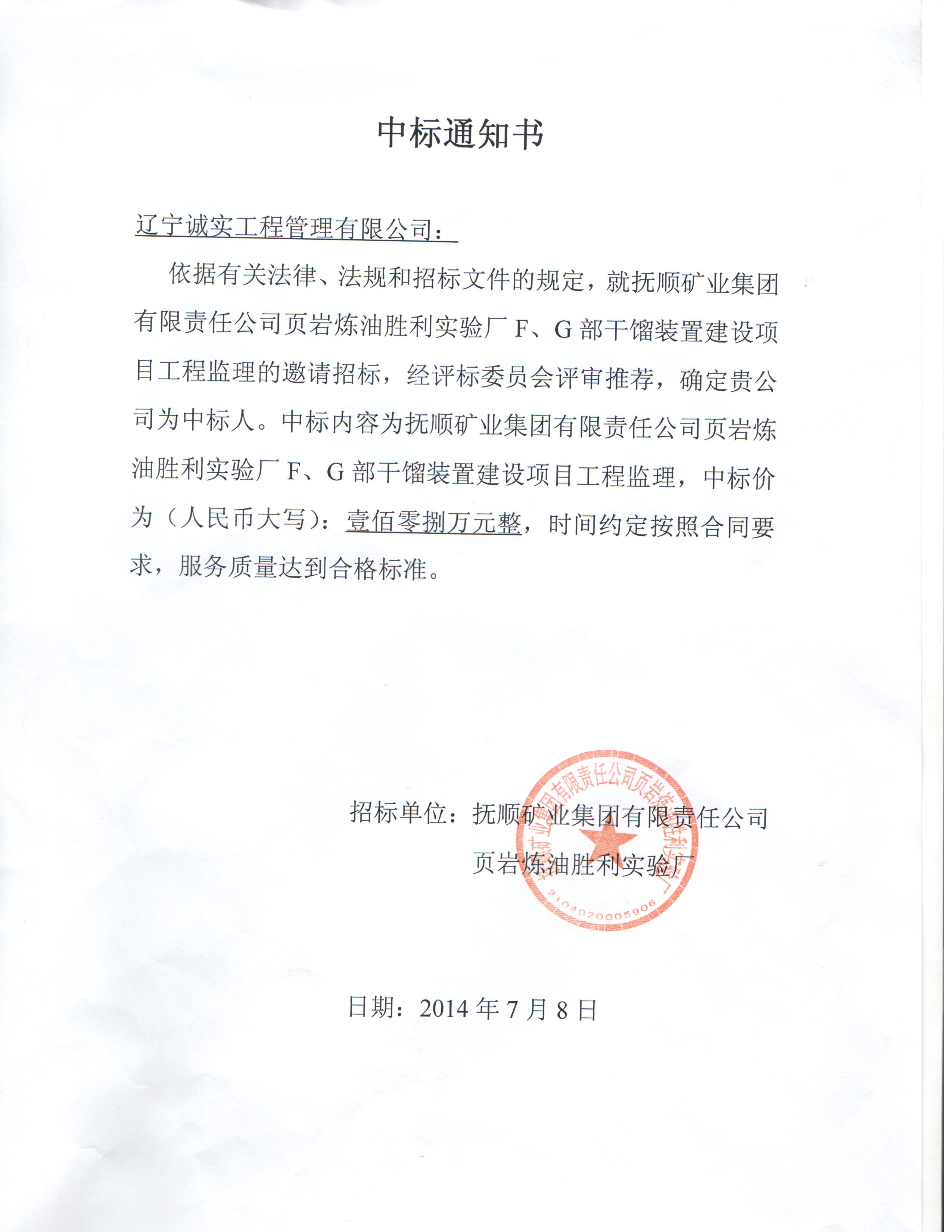 我公司成功中標撫順礦業(yè)集團有限責任公司頁巖煉油勝利實驗廠F、G部干餾裝置建設項目工程監(jiān)理項目