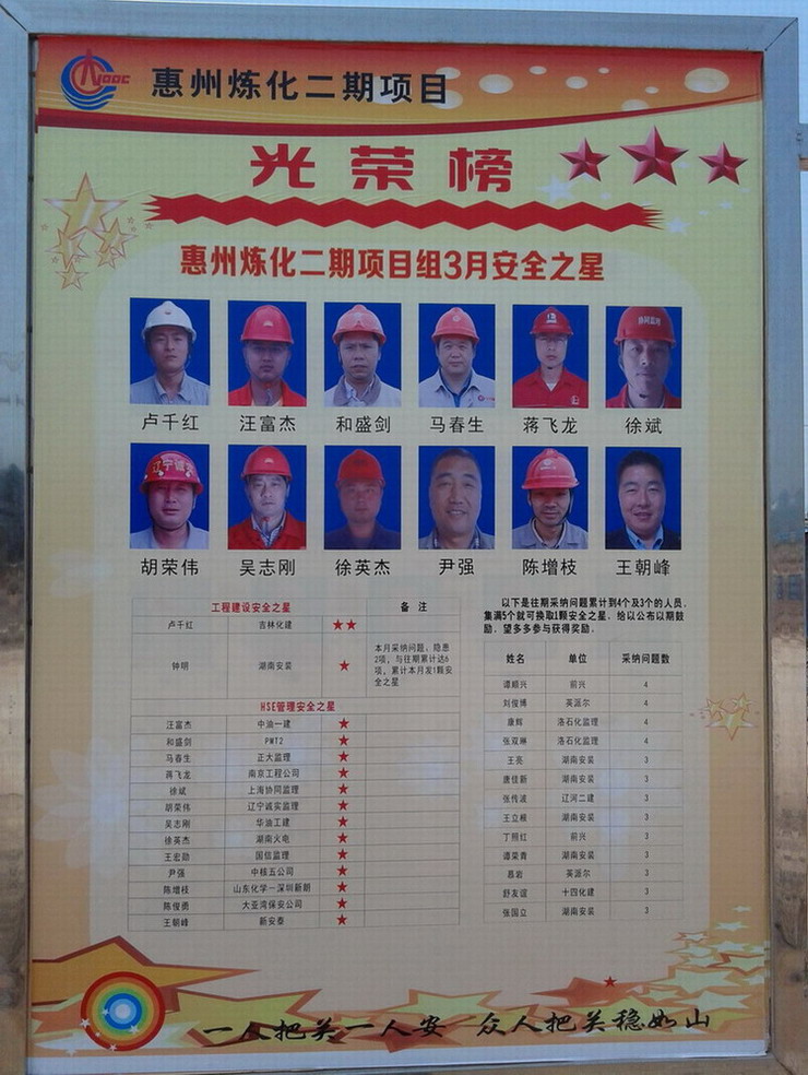 遼寧誠實工程管理有限公司中海石油惠州煉化項目監(jiān)理部HSE監(jiān)理工程師胡榮偉,喜登業(yè)主中海石油煉化公司惠州煉化分公司設(shè)立的三月安全之星光榮榜,體現(xiàn)了中海石油煉化公司惠州煉化分公司對我公司監(jiān)理服務(wù)的信任與認(rèn)可。
